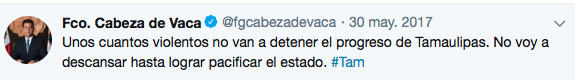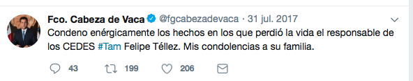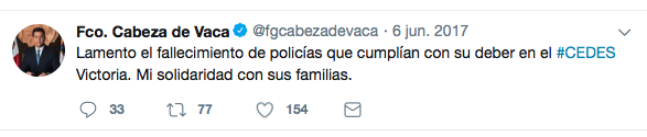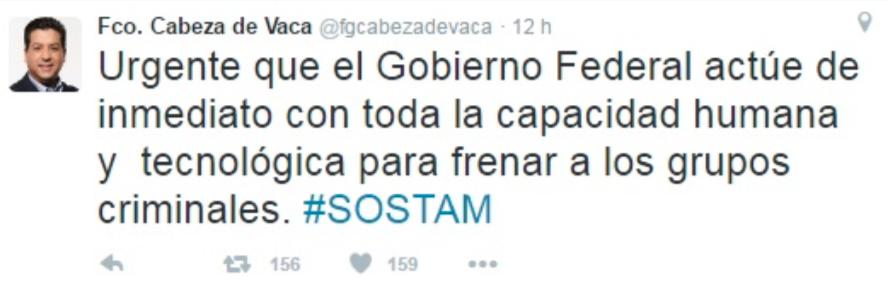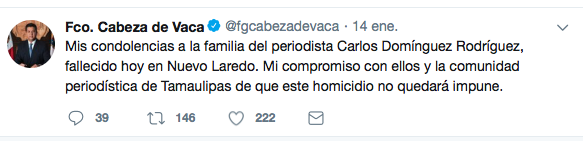 A raíz de la mas reciente ejecución de Pedro Hugo Carrizalez Comandante de la Policia Ministerial de Tamaulipas acontecida en Reynosa,el Gobernador de la entidad Francisco Javier Garcia Cabeza de Vaca hizo lo que acostumbra, lamentar y condenar acontecimientos, mas que cumplir la obligación constitucional de resolverlos,funcion para la que se «alquilo» a los ciudadanos, mas que acudir al discurso y la simulación que no acompaña resultados, todos los acontecimientos se encuentran impunes, desde la ejecución de 4 funcionarios de la PGJE en Nuevo Laredo masacrados por zetas en enero de 2017 donde ofreció todo el «poder del estado»,al mas reciente asesinato del servidor publico en Reynosa sin descontar la ejecución y heridas a estatales en Miguel Alemán y Santa Engracia,en todos ellos hay una constante los «CRIMENES ESTAN IMPUNES,IRRESOLUTOS y SIN CASTIGO».