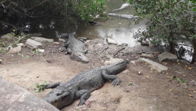 Cocodrilos salen fuera de la Laguna del Carpintero.