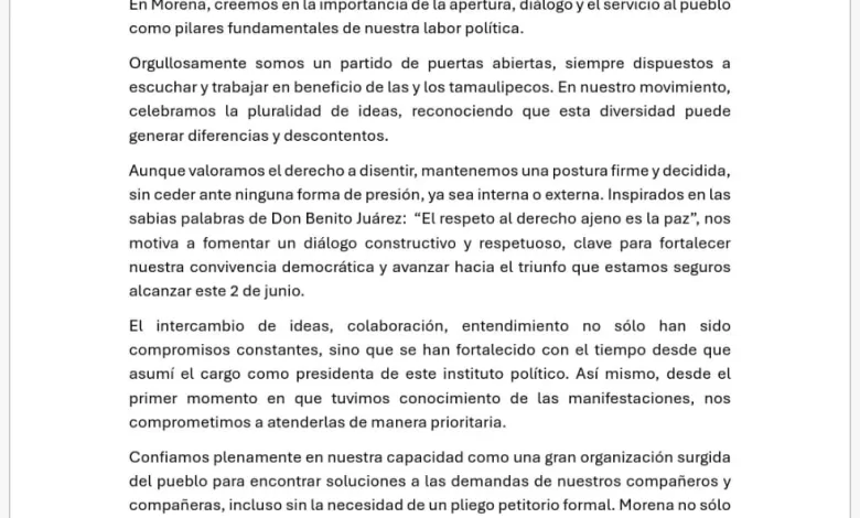 Confiamos plenamente en nuestra capacidad como una gran organización surgida del pueblo para encontrar soluciones a las demandas de nuestros compañeros y compañeras, incluso sin la necesidad de un pliego petitorio formal. Morena no sólo representa, sino que seguirá siendo la incansable voz de la esperanza de México. En Tamaulipas, estamos decididos a liderar la transformación hacia un futuro más justo y próspero para todos.
