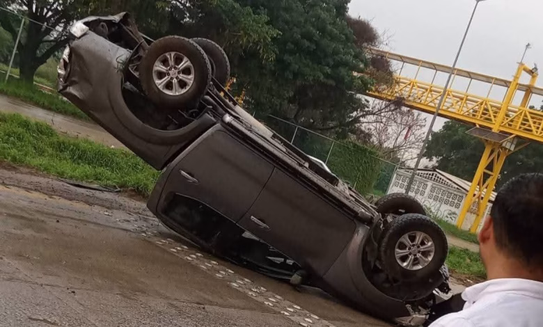 Camioneta derrapa por pavimento mojado y vuelca rumbo al puerto industrial de Altamira, el accidente provocó la movilización de las corporaciones de emergencia