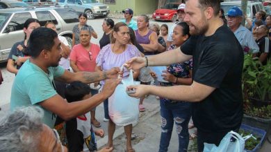 Reciben en Infonavit La Sauteña a Paco González; entrega comestibles