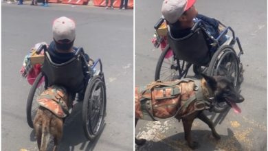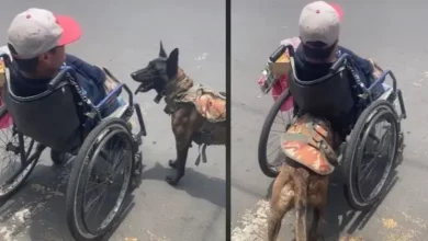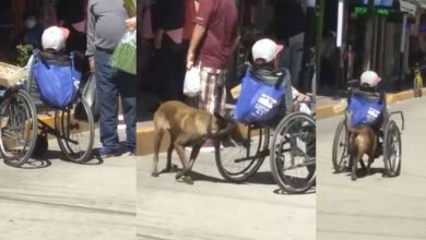 Ella es «Keily» la famosa perrita que empuja a su dueño en silla de ruedas para vender dulces